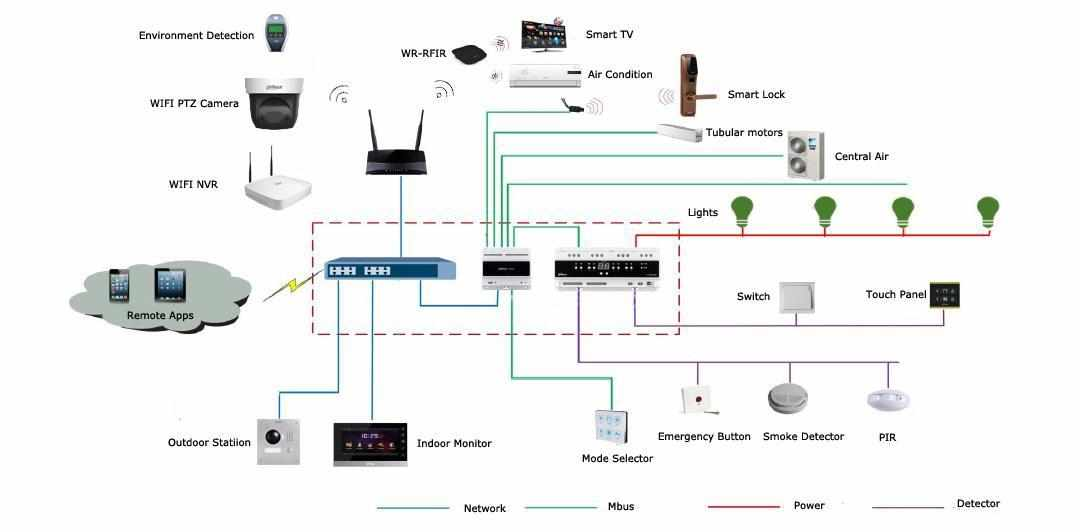 Hệ thống nhà thông minh tích hợp camera, báo khói, cảm biến PIR, chiếu sáng, điều hòa, khóa cửa, TV, rèm, intercom, nútkhẩn cấp và các thiết bị điện trên một nền tảng trung tâm, cho phép giám sát – điều khiển – tự động hóa đồng bộ thông qua mạng, M-Bus và ứng dụng từ xa.
